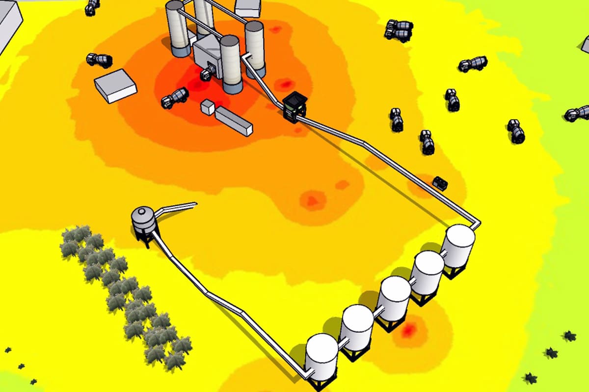 dBAS Soluciones Acústicas realiza mapas de ruido a través de su software predictivo para propagación y modelamiento, ya sea desde fuentes de ruido puntuales, multipuntuales, fuentes lineales, muros, encierros y edificios.